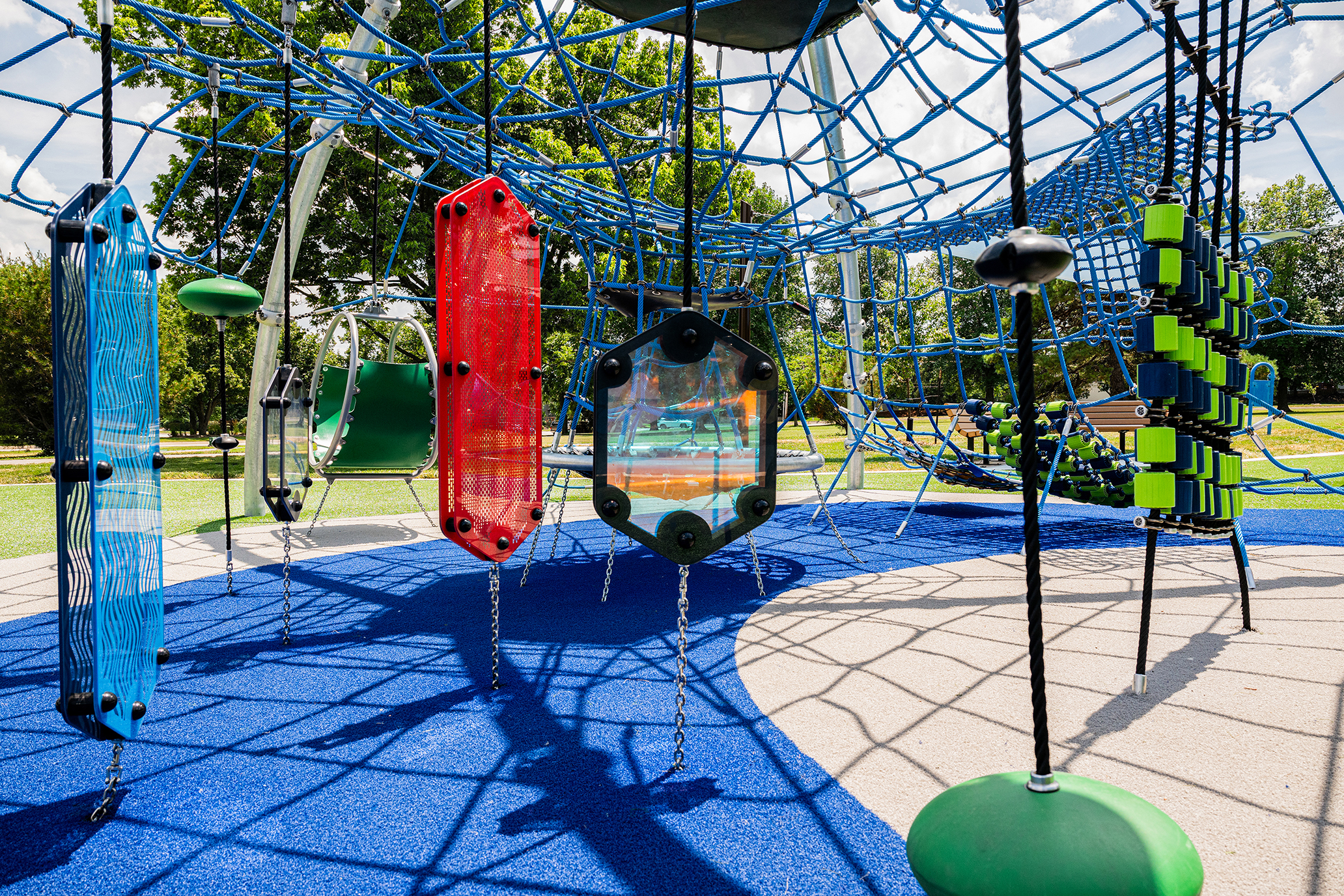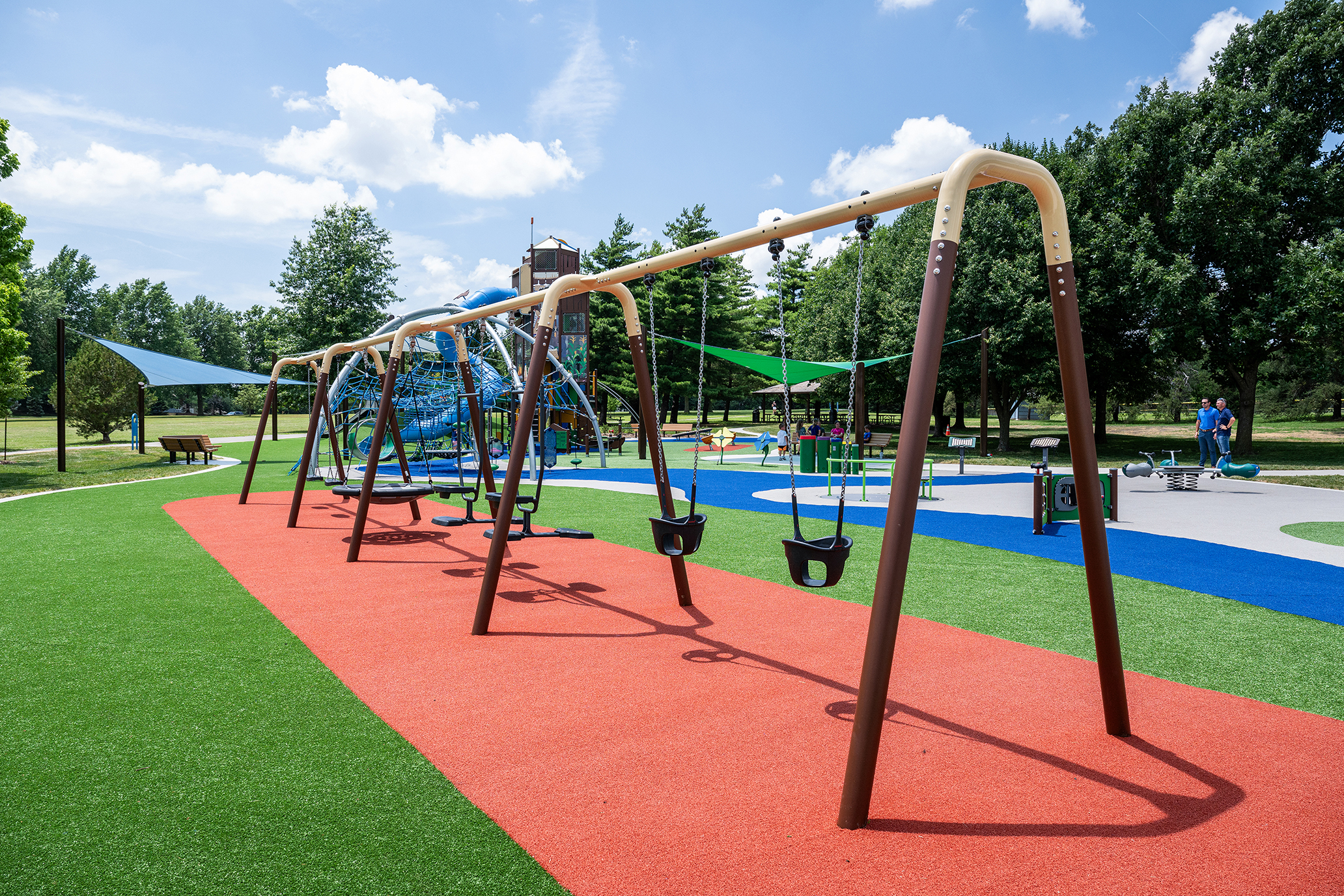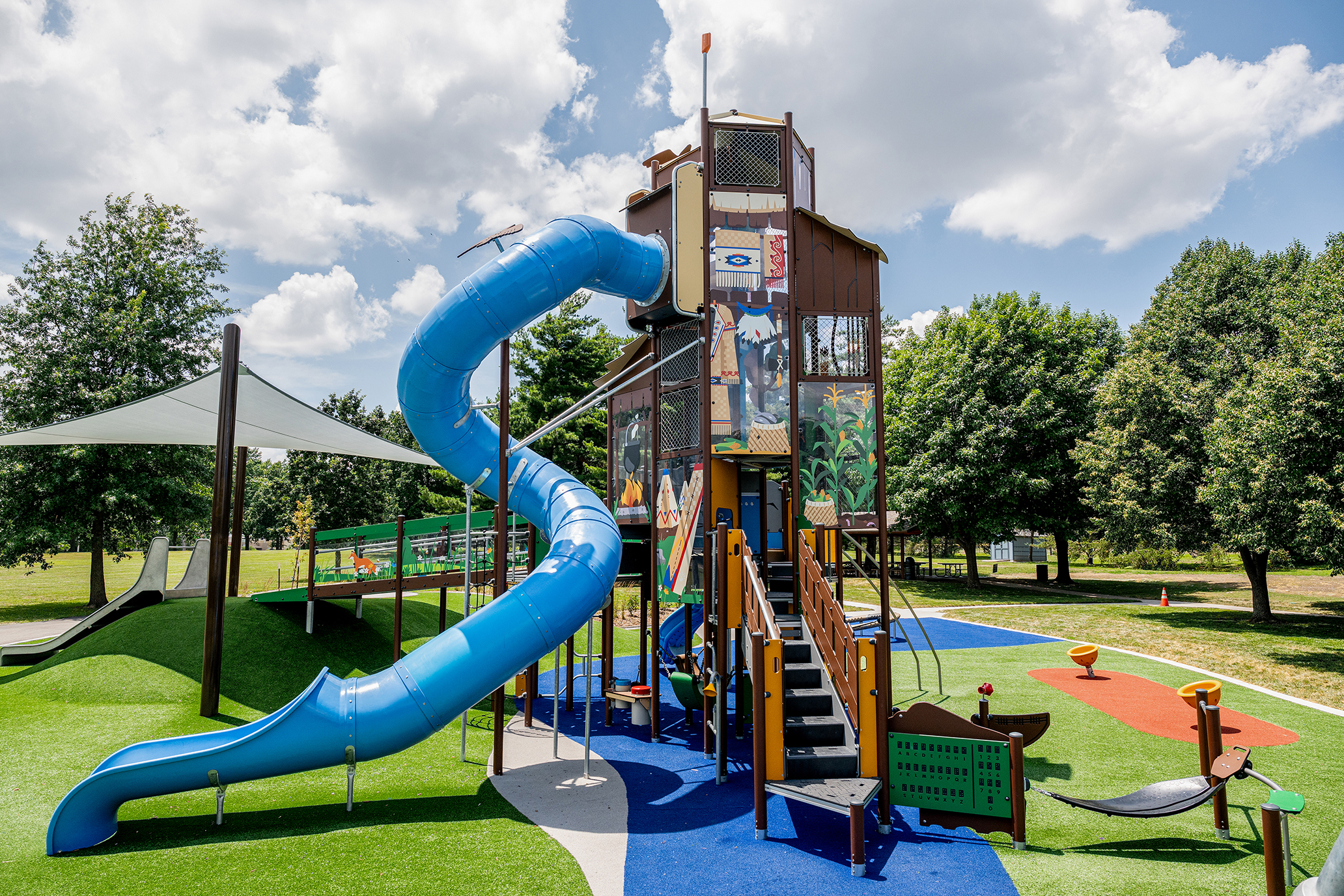 The playground’s design pays tribute to Chief Black Bob through a custom play tower featuring Native American-inspired colors and art panels. But honoring history was just the beginning—the space was designed to be accessible and engaging for all ages and abilities.