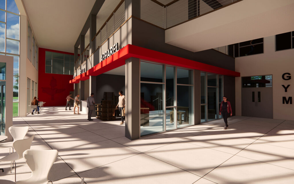The main level/lobby of the facility will contain several spaces for eateries and retail, including a College book store. Designed to give a “Main Street” feel this area is meant to give students a place to study and socialize, community members a place to shop and dine, and those attending campus events or soccer tournaments a place to relax. Bathrooms within the facility are hardened to provide public storm shelters.