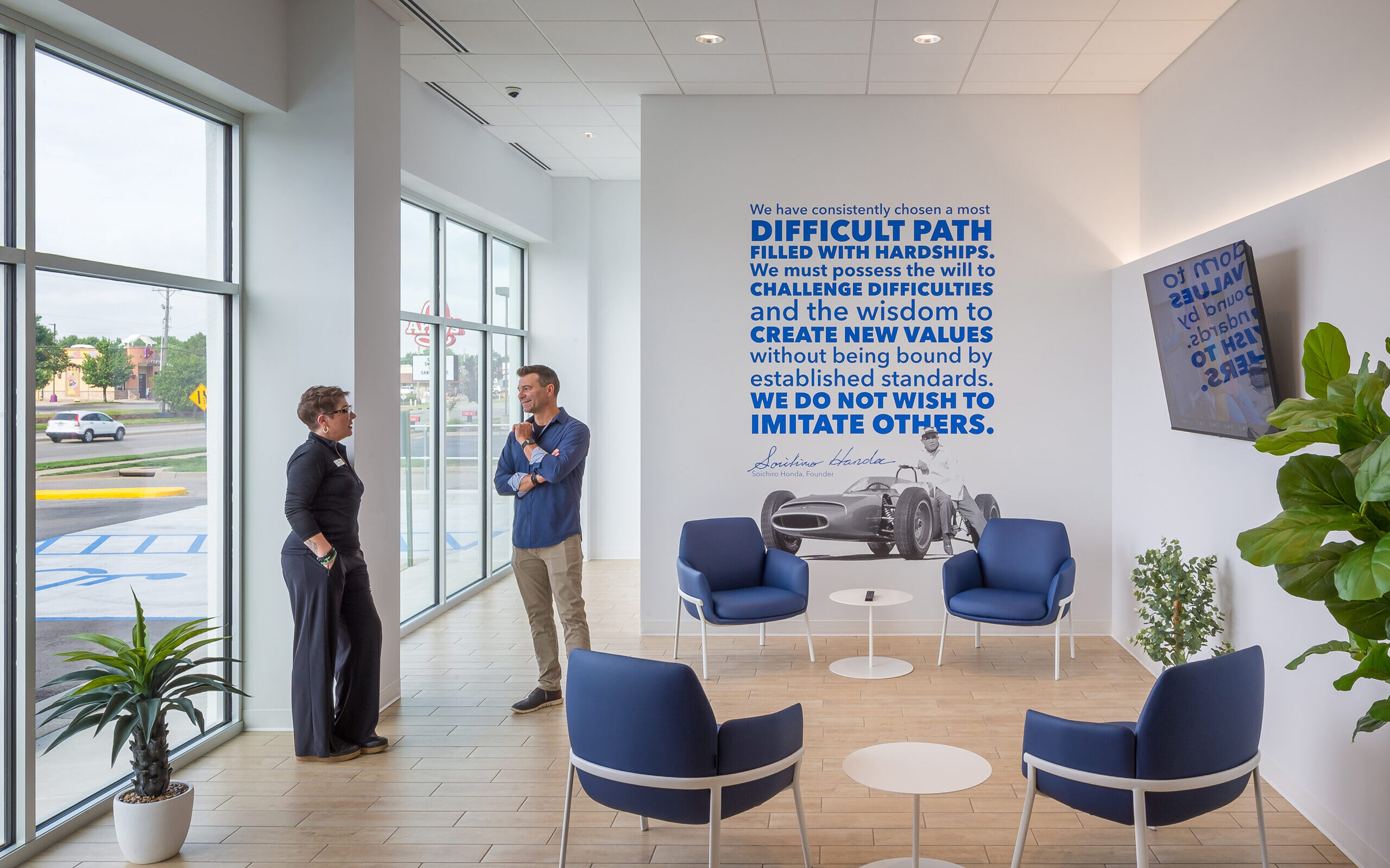 One of the unique aspects of this project was the opportunity to collaborate with Honda’s national brand architect, ChangeUp. The TESSERE team worked closely with both ChangeUp and Schofield to craft a design that honored Honda’s brand standards while still reflecting Schofield’s specific goals for the space. It was a true collaboration—rooted in flexibility, trust, and a shared vision for a facility that looks great, functions seamlessly, and stays true to the identity of both the brand and the local business.