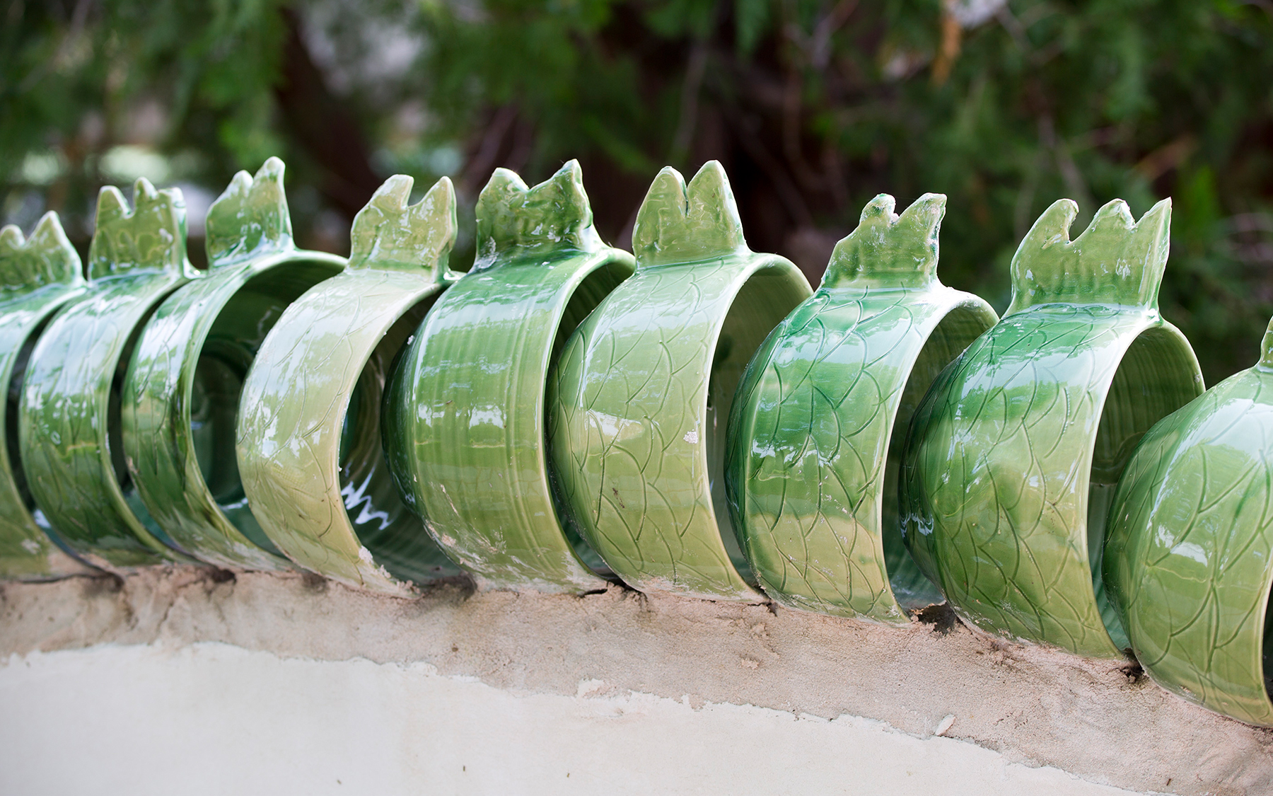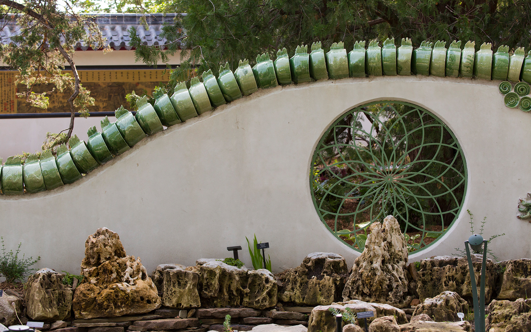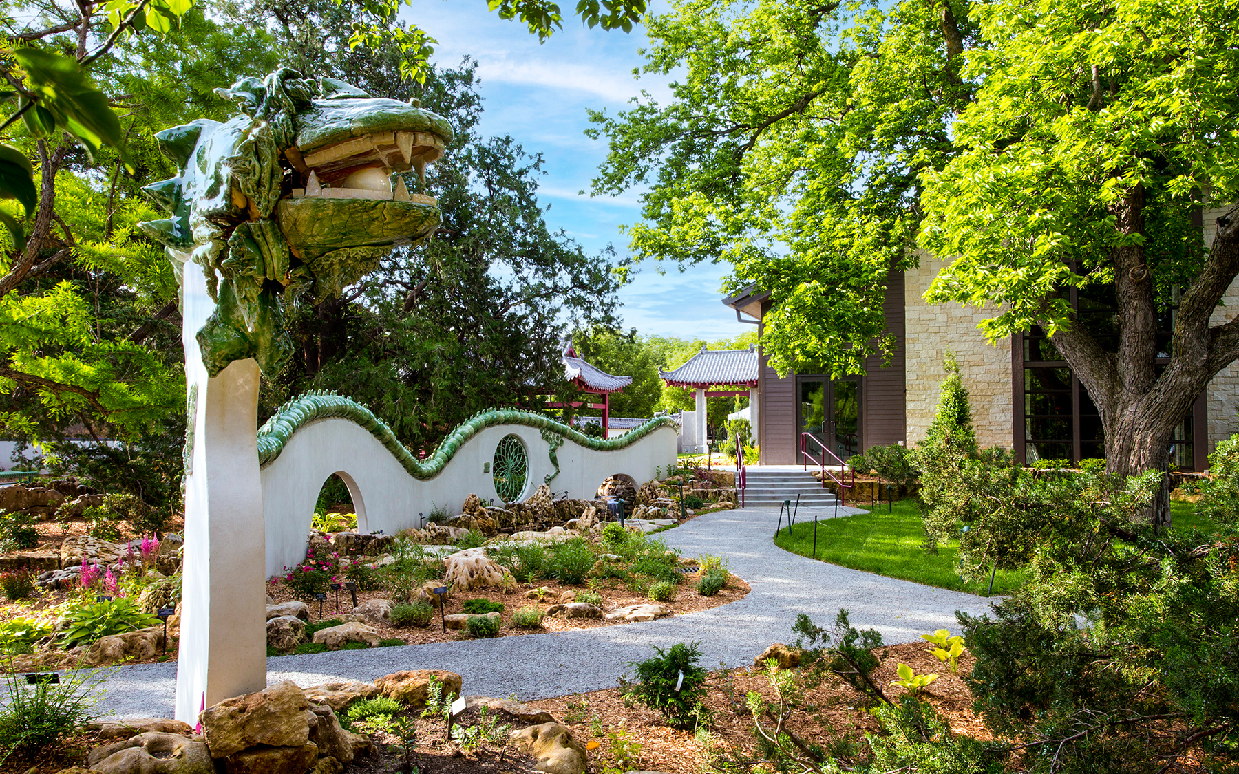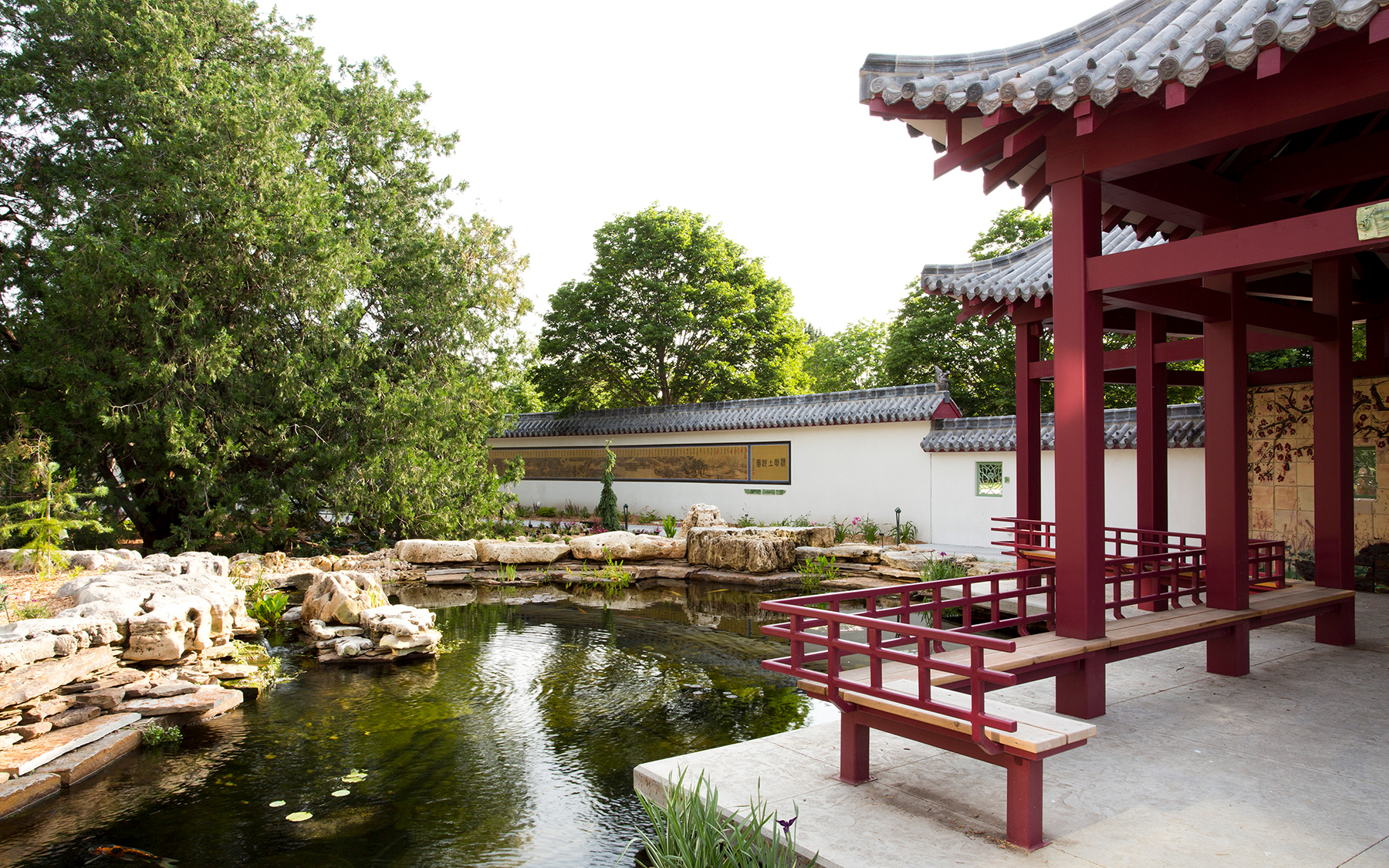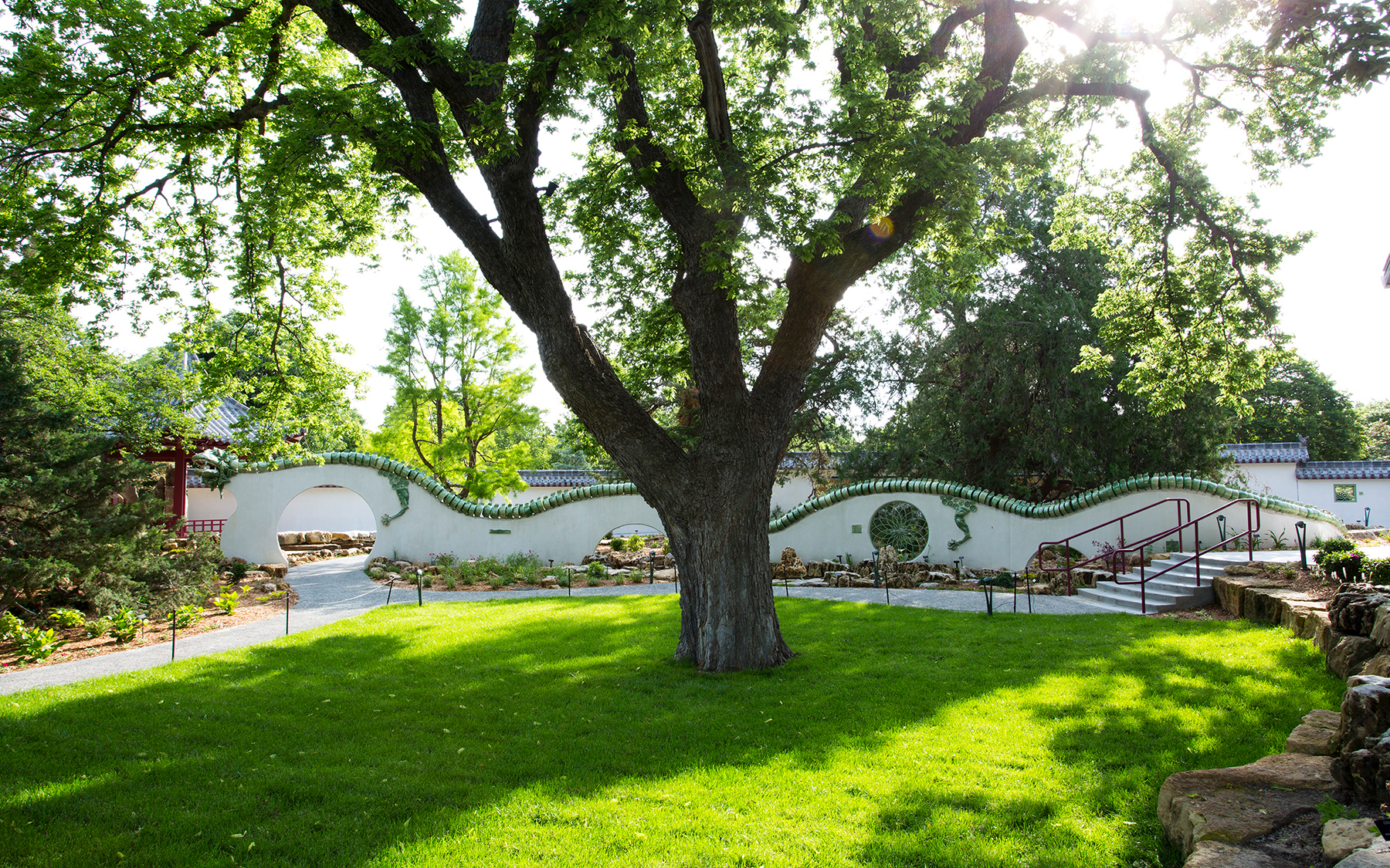 With exquisite gardening techniques and deep cultural details, the Chinese Garden of Friendship benefits the entire Wichita community and promotes the long-standing friendship with our sister city, Kaifeng, China. The elegant Sung Dynasty-style design creates a series of unique spaces found in a traditional Chinese scholar-style garden. Guarded by two Foo Dogs, the garden interior contains a replica Qingming River Festival scroll, Treasured Friend Pavilion, Thousand-Foot Bridge, Rose Wind Pavilion, one large leak window, ten smaller leak windows, and an 87-foot-long undulating dragon wall with clay porcelain roof tiles.
