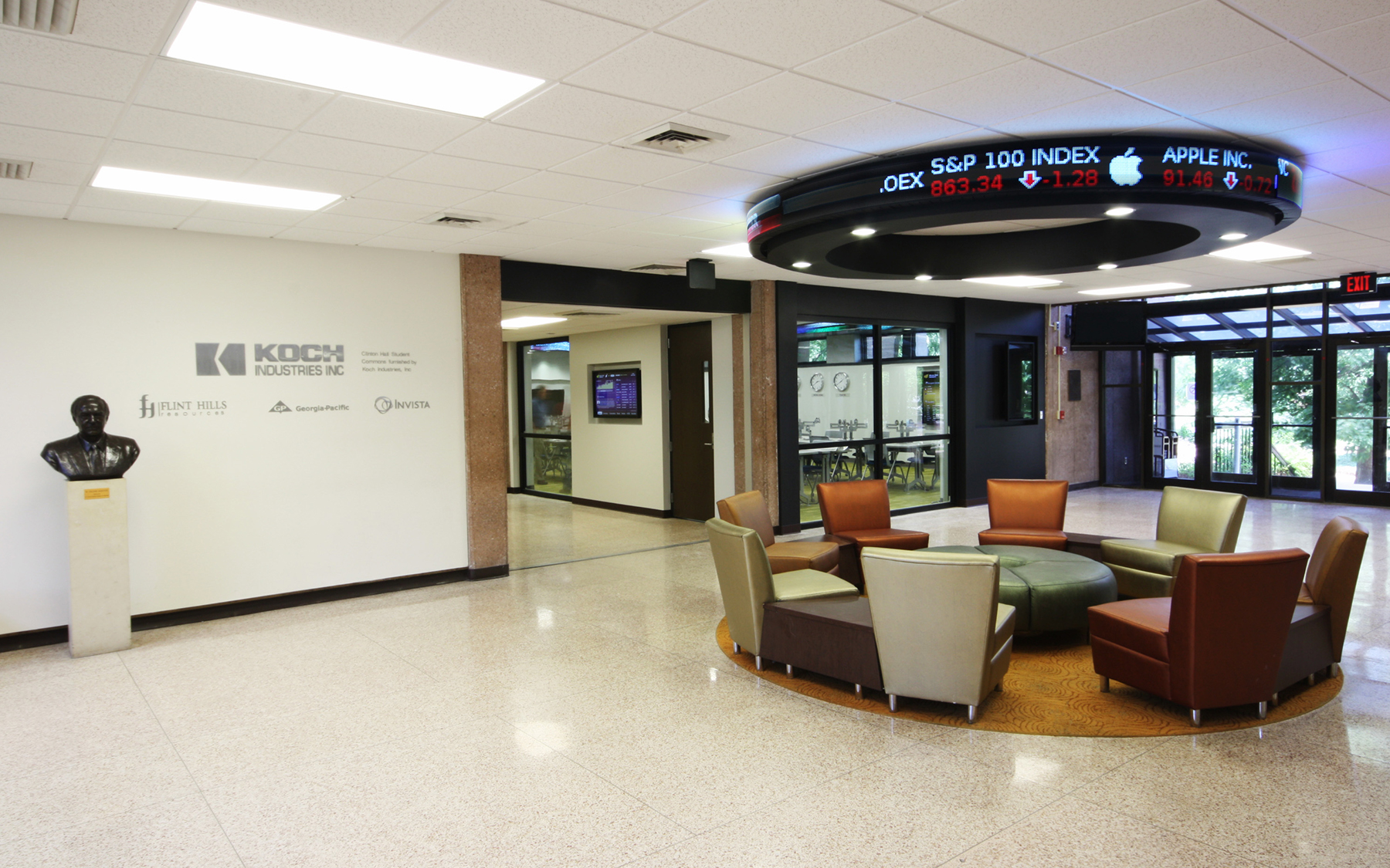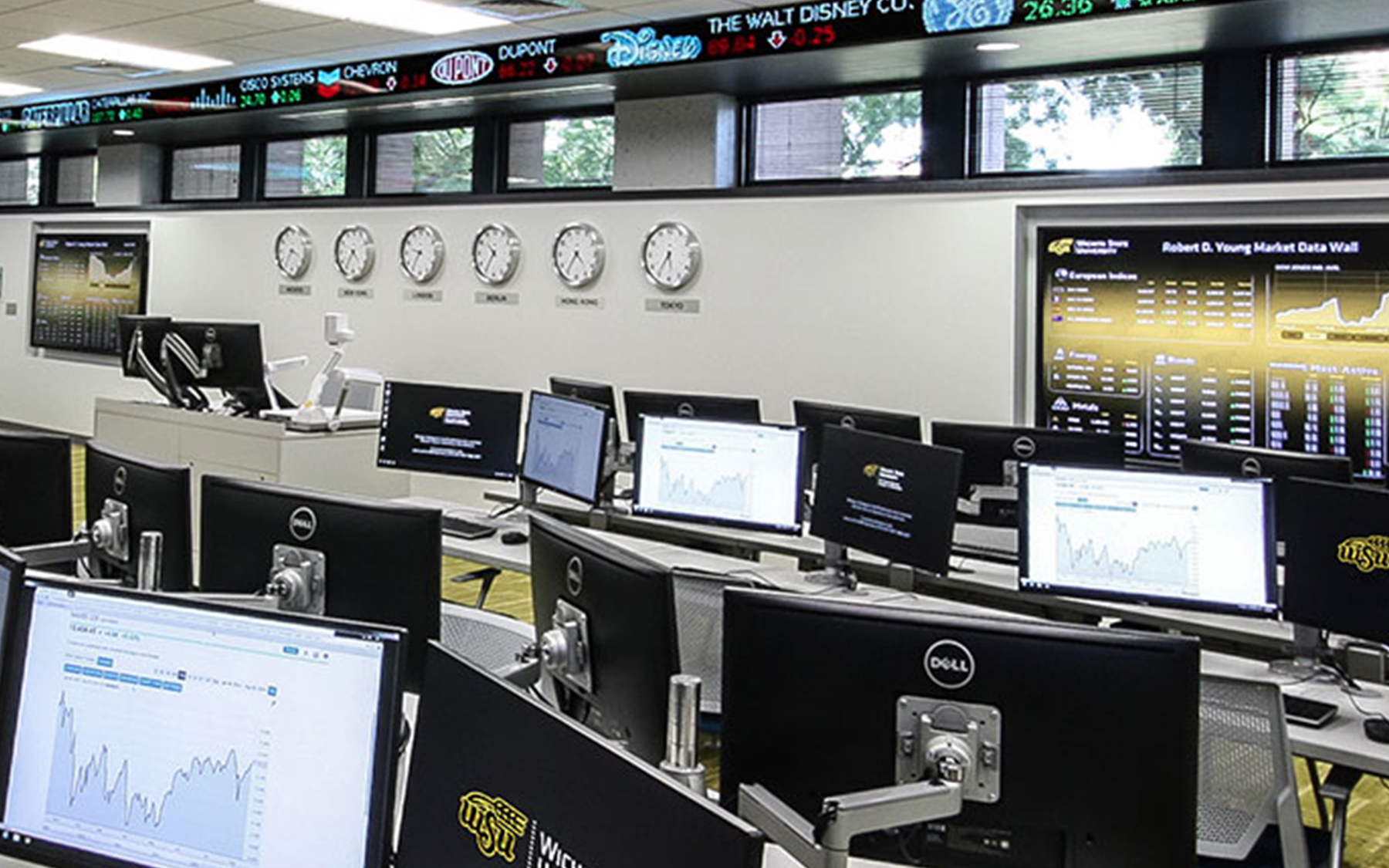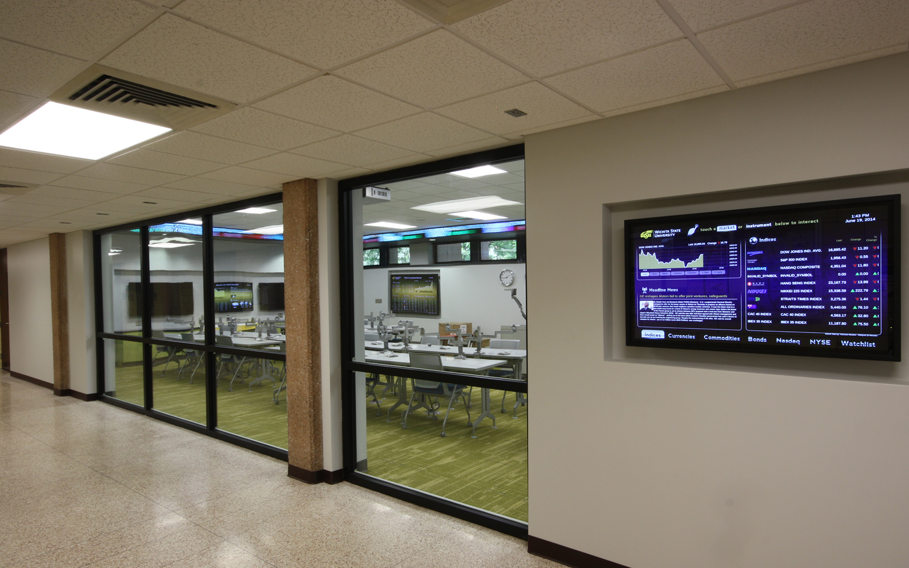 The 800-square-foot lab features 30 dual-monitor workstations and five wall-mounted flat-screen monitors displaying live market data and television feeds. A 60-foot-long digital financial ticker wraps around the interior perimeter, while a second 30-foot-long circular ticker is suspended from the lobby ceiling. Ceiling-height glass windows provide passing students the opportunity to observe this fast-paced learning environment.