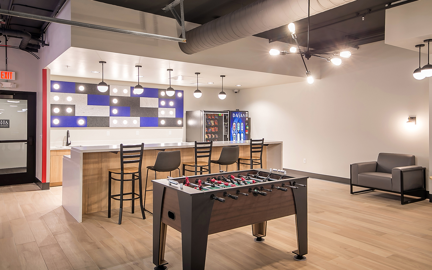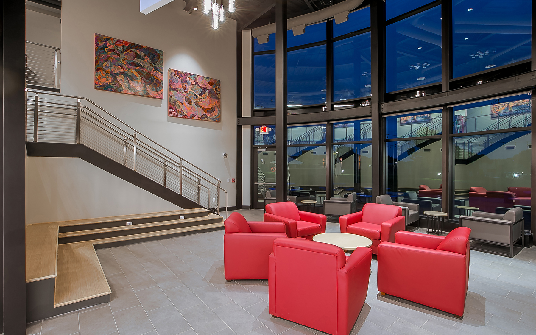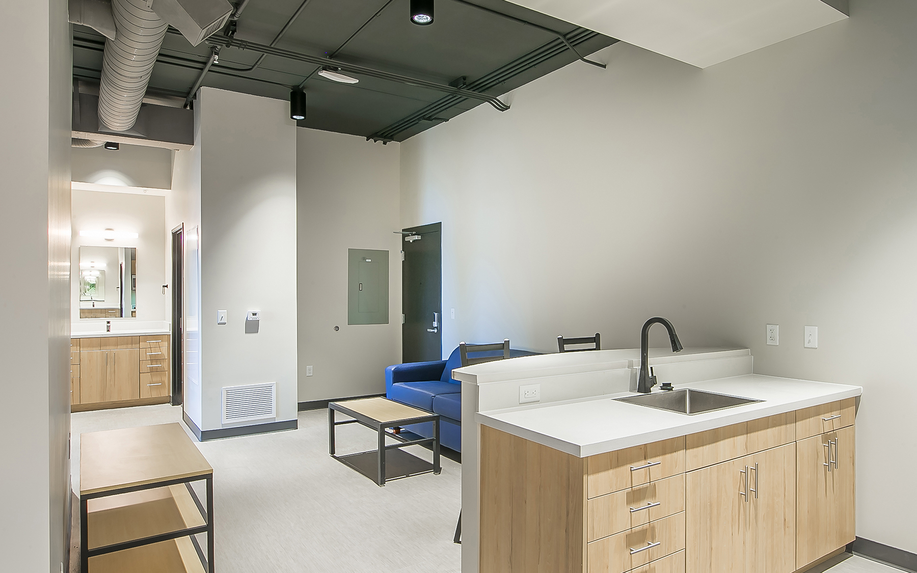 Exterior amenities include outdoor fire places, grilling areas, open patio seating, a half-court basketball court, large amphitheater, and relaxing hammock grove. This project included a new wraparound drive from the parking area to the entrance of the building, then onto the existing street. There were complicated utility reroutes included in the design for this project. There was also existing parking lot rehabilitation work as well as storm water routing through the public right-of-way as part of the scope.