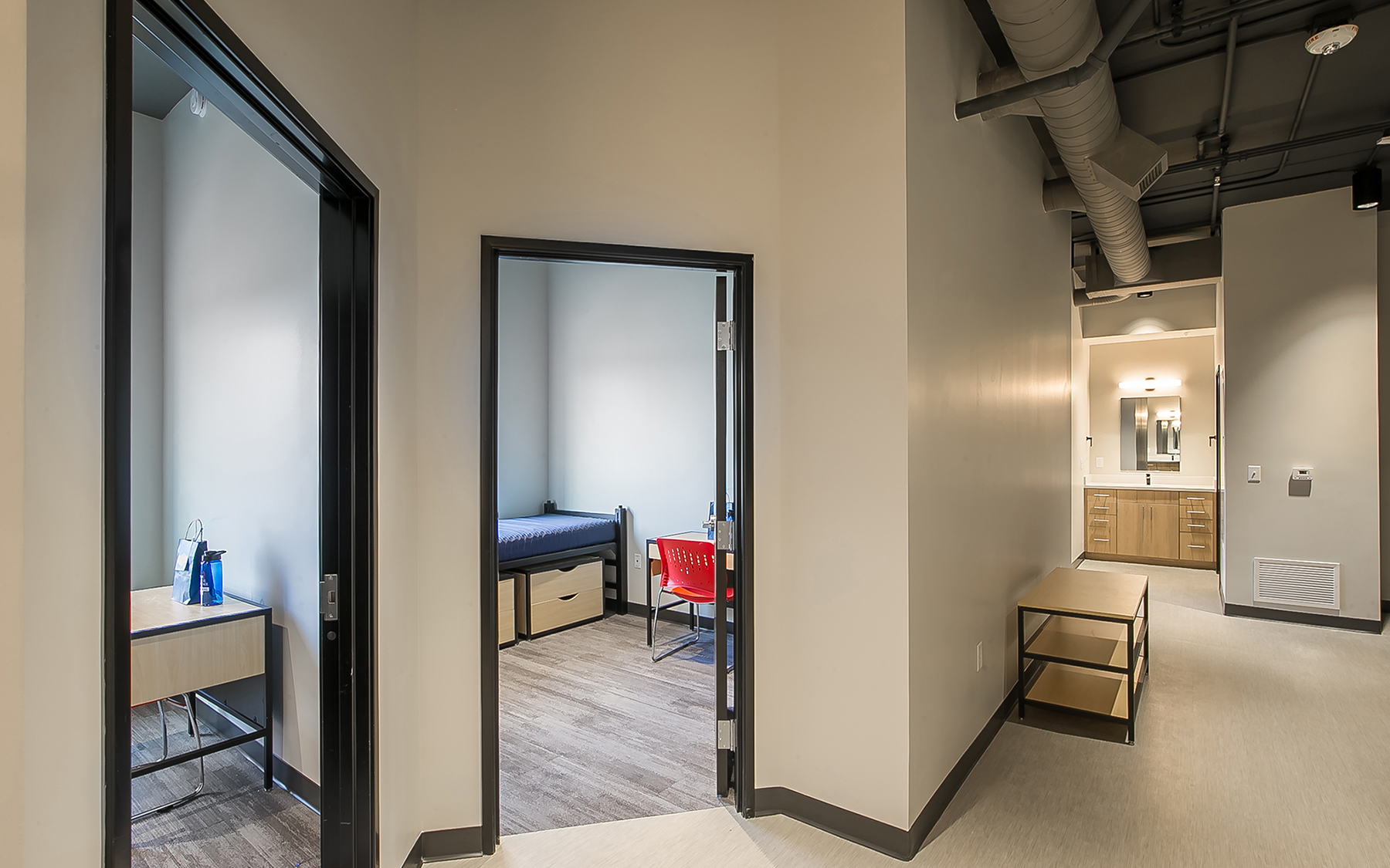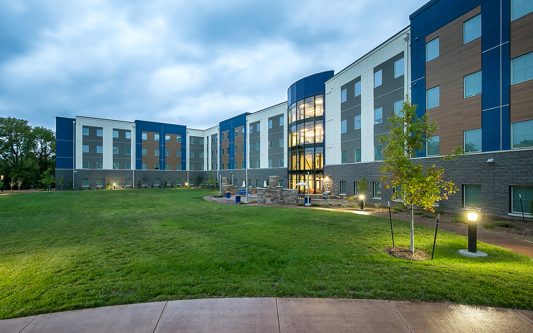 Working with Kansas City Kansas Community College, our developer-driven, design-build team constructed a new student housing complex to increase the quality of living for students on the west side of campus. The new housing features four stories with 73 apartment units that include 260 sleeping rooms with walkout apartment options in the basement. Among the amenities included are a multi-media lounge with eGaming, laundry facilities, various study rooms and spaces, multiple multipurpose meeting spaces, increased storage space in each apartment, ADA compliance, and a mail distribution area. The project also includes an interior FEMA-rated tornado shelter in the basement.