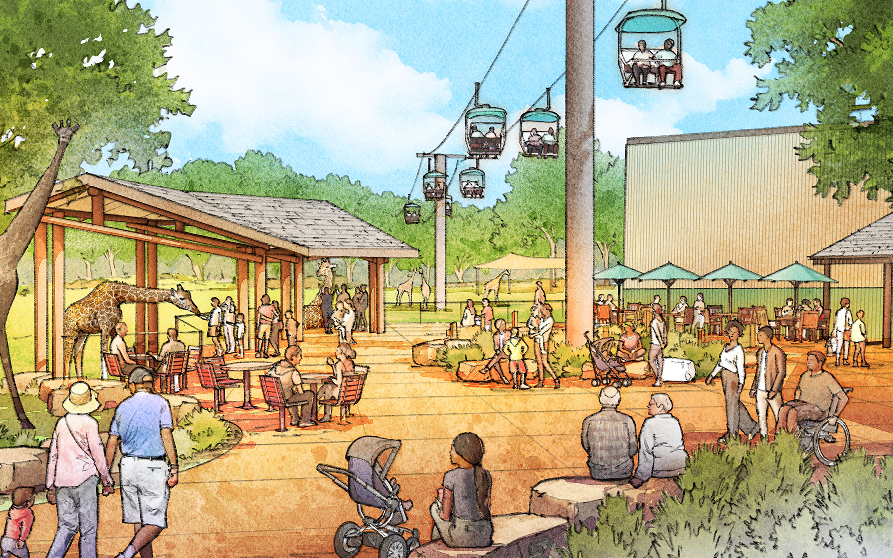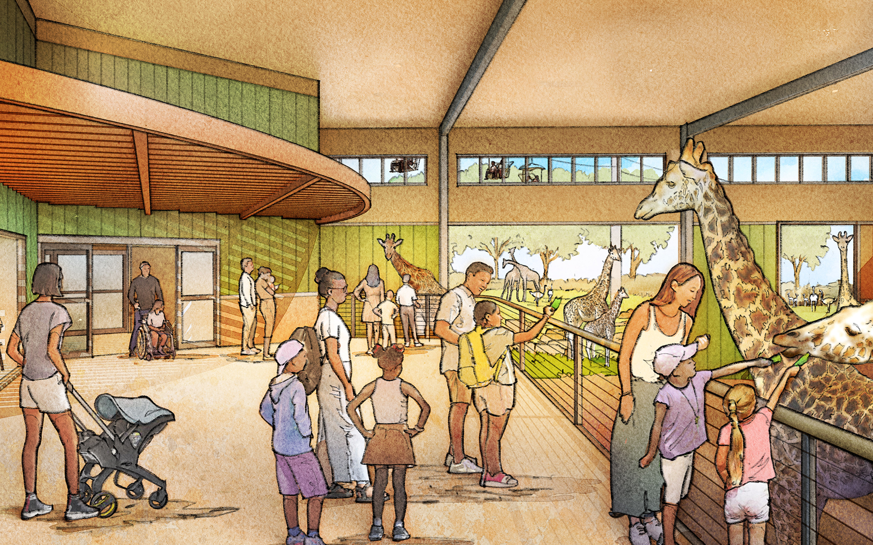 Guests now arrive at a vibrant new plaza that seamlessly connects the giraffe experience with the sky safari station and neighboring rhino, chimpanzee, and hippo habitats. Indoor and outdoor feeding opportunities bring visitors face-to-face with the herd, while panoramic shaded views, indoor dining with sightlines into the barn, and inclusive family restrooms with adult changing and nursing facilities create a welcome oasis at the farthest point in the Zoo.