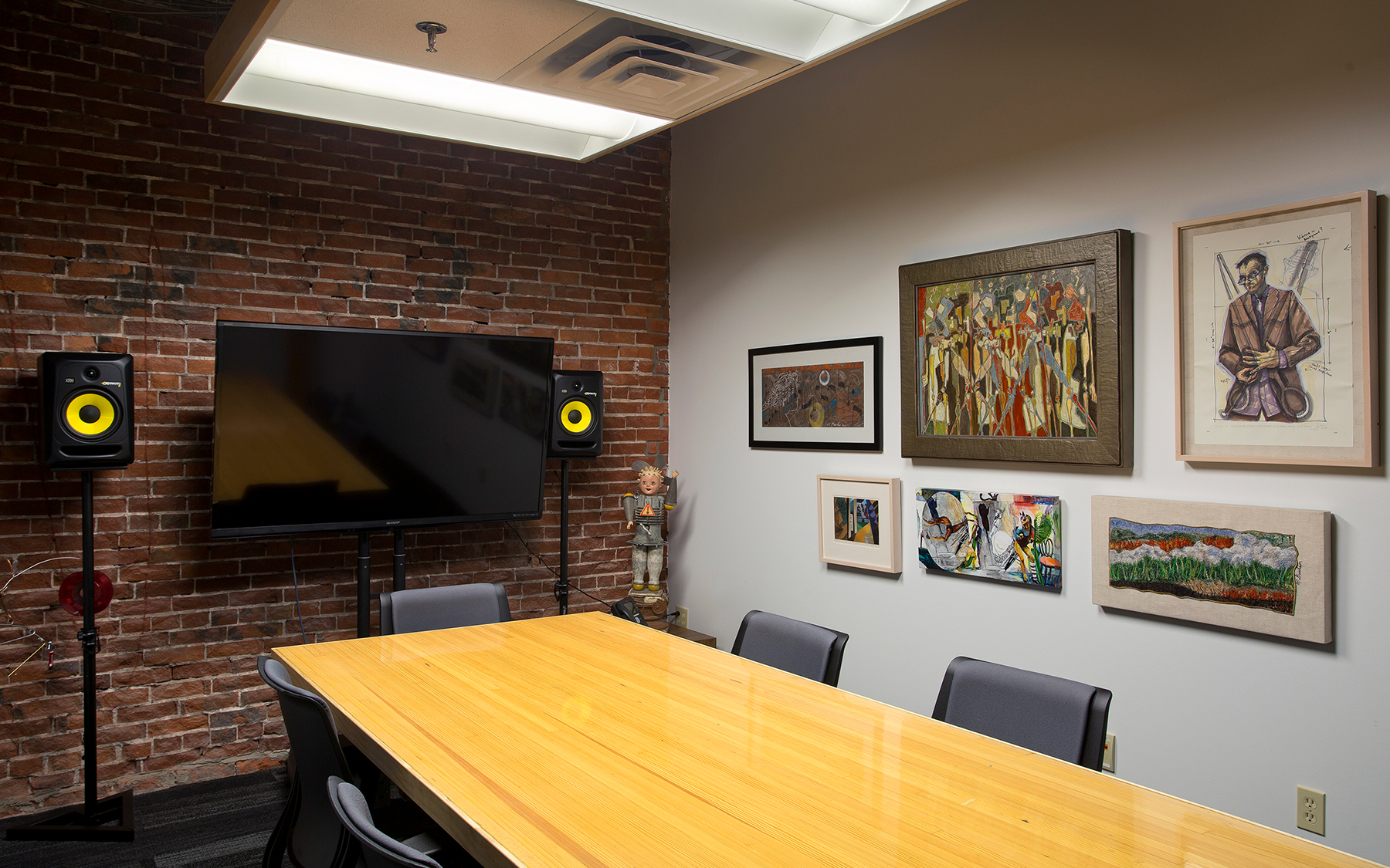 Our team remodeled an existing 7,000-square-foot office space in the Old Town area of the city. The goal was to maintain the raw industrial feel of the exposed brick and paint on concrete. A key design feature is the glass overhead garage door as the main entry, which reiterates the station’s open-door policy as well as tying back to the live music component of the station. This has been immensely popular as an inviting transparency element and in welcoming the public into the station’s space. Recording studios jumped from just three at the previous location to nine at the new one, along with significant upgrades to acoustics and sound recording capabilities.