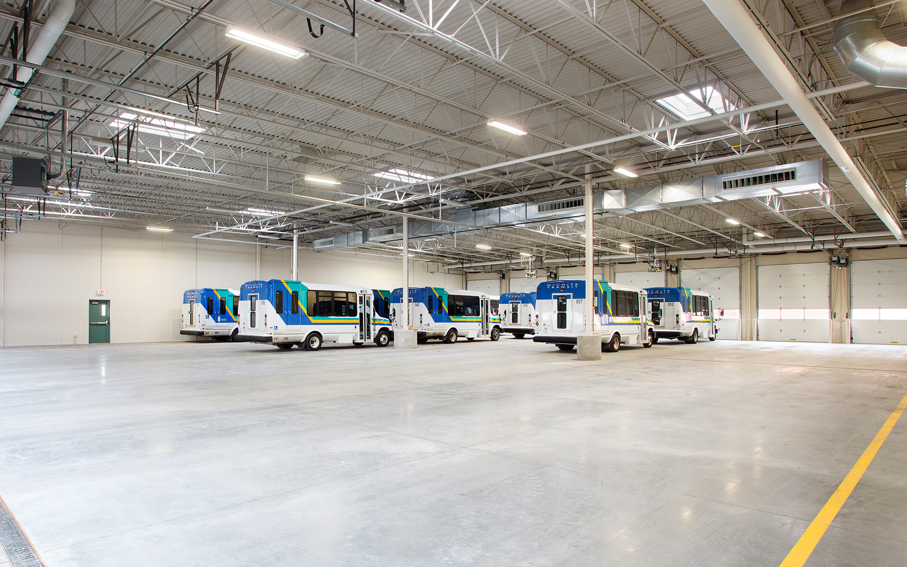 TESSERE designed this new 23,000-square-foot design-build facility for storage and maintenance. Designed to match surrounding city structures, the LEED Silver building houses up to 28 vehicles and includes maintenance bays, an automated wash bay, a parts storage area, conference space, and a training area.
