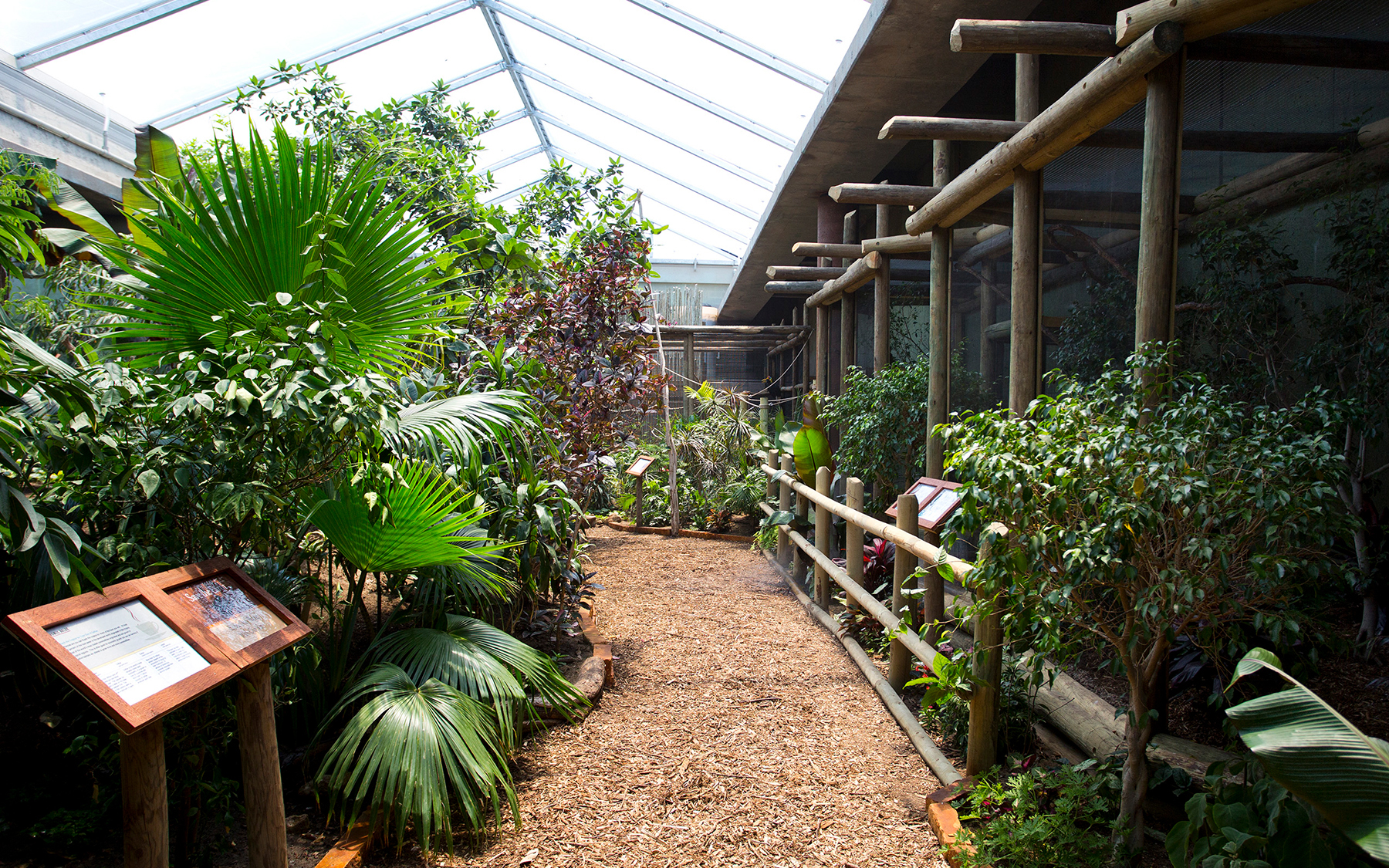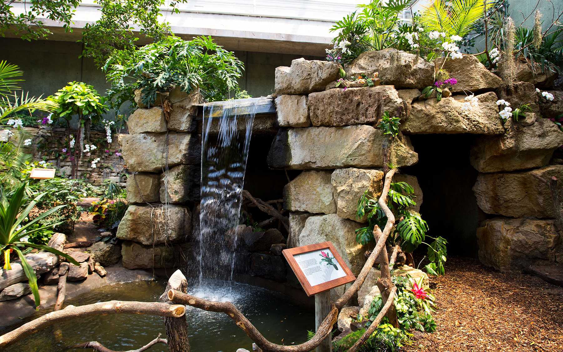 The new roof has allowed for increased flexibility for plant life, with a new highlight being the exotic species wall, featuring a large collection of orchids. Ambient air temperature is maintained at 80 degrees with 50 to 70 percent humidity, creating a genuinely tropical environment.